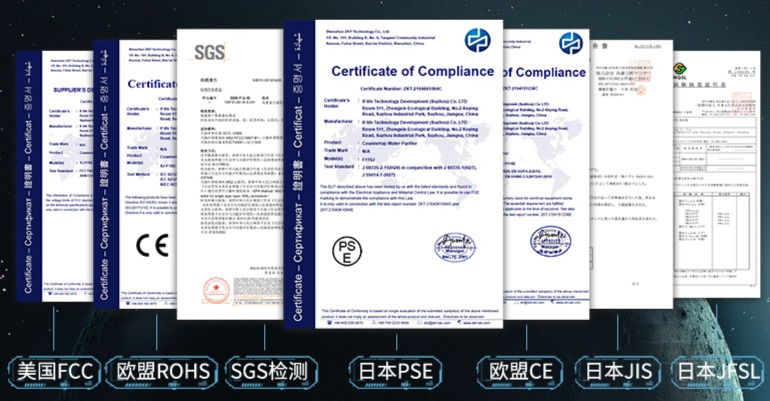 热销爆品旗舰款桌面净水机,是国内唯一一款同时取得美国FCC、欧盟CE、欧盟ROHS、日本PSE等国际认证,并出口到美国、英国、欧盟和日本等十几个国家(地区)的净水产品